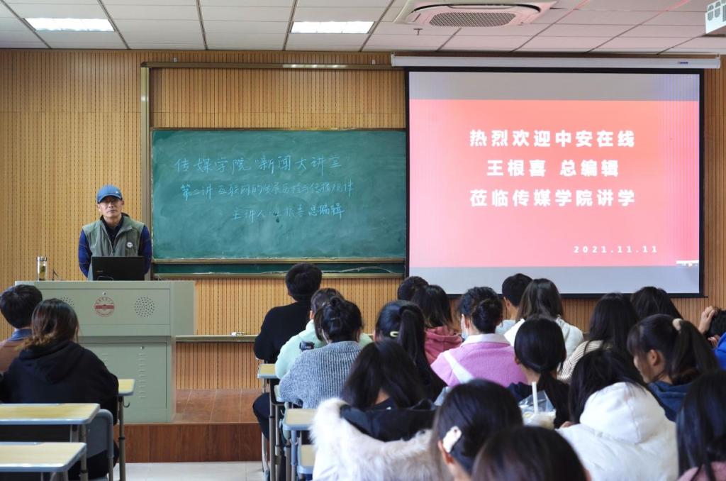 11月11日下午,中安在线总编辑王根喜在K518教室作了题为“互联网的传播历程与传播规律”的专题讲座,william威廉中文官网2021级全体研究生和部分本科生共100人聆听了讲座。讲座由william威廉中文官网副经理王业明主持。