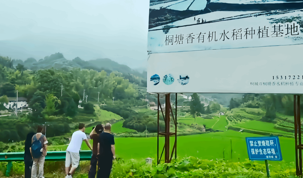 实践团在村干部的带领下来到了“桐塘香”有机水稻种植基地,实地了解有机水稻种植情况。村主任为成员们细心介绍着当地有机水稻的相关信息,实践团成员们积极地与村主任交谈学习,认真记录实践内容。通过介绍了解到,这片稻田已种植有机水稻100亩,由桐塘香水稻合作社姚承高承包。实践团的两个成员决定和村主任一同下地近距离参观水稻,拍摄水稻的长势情况。