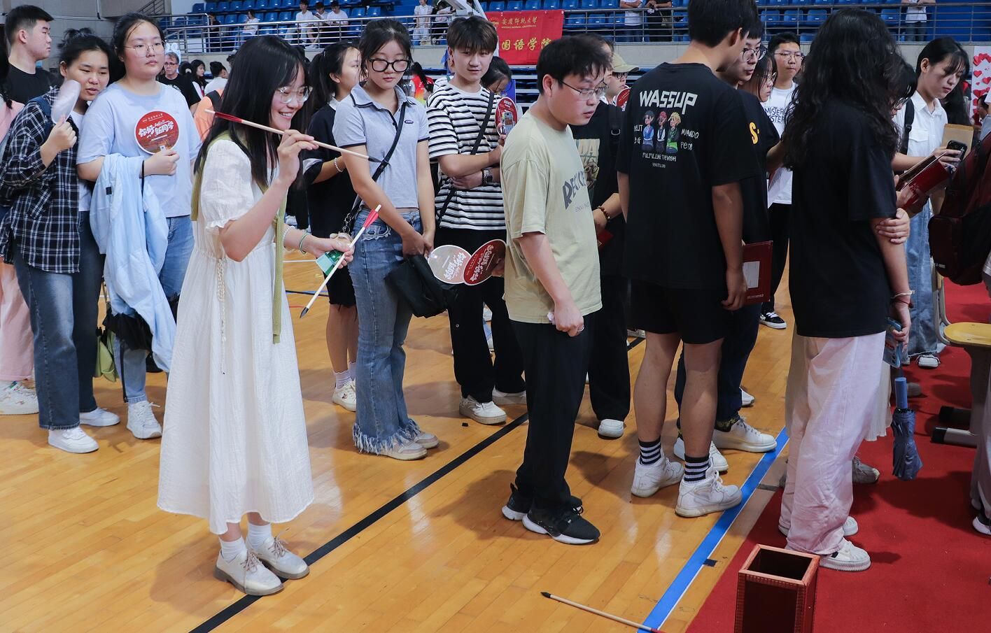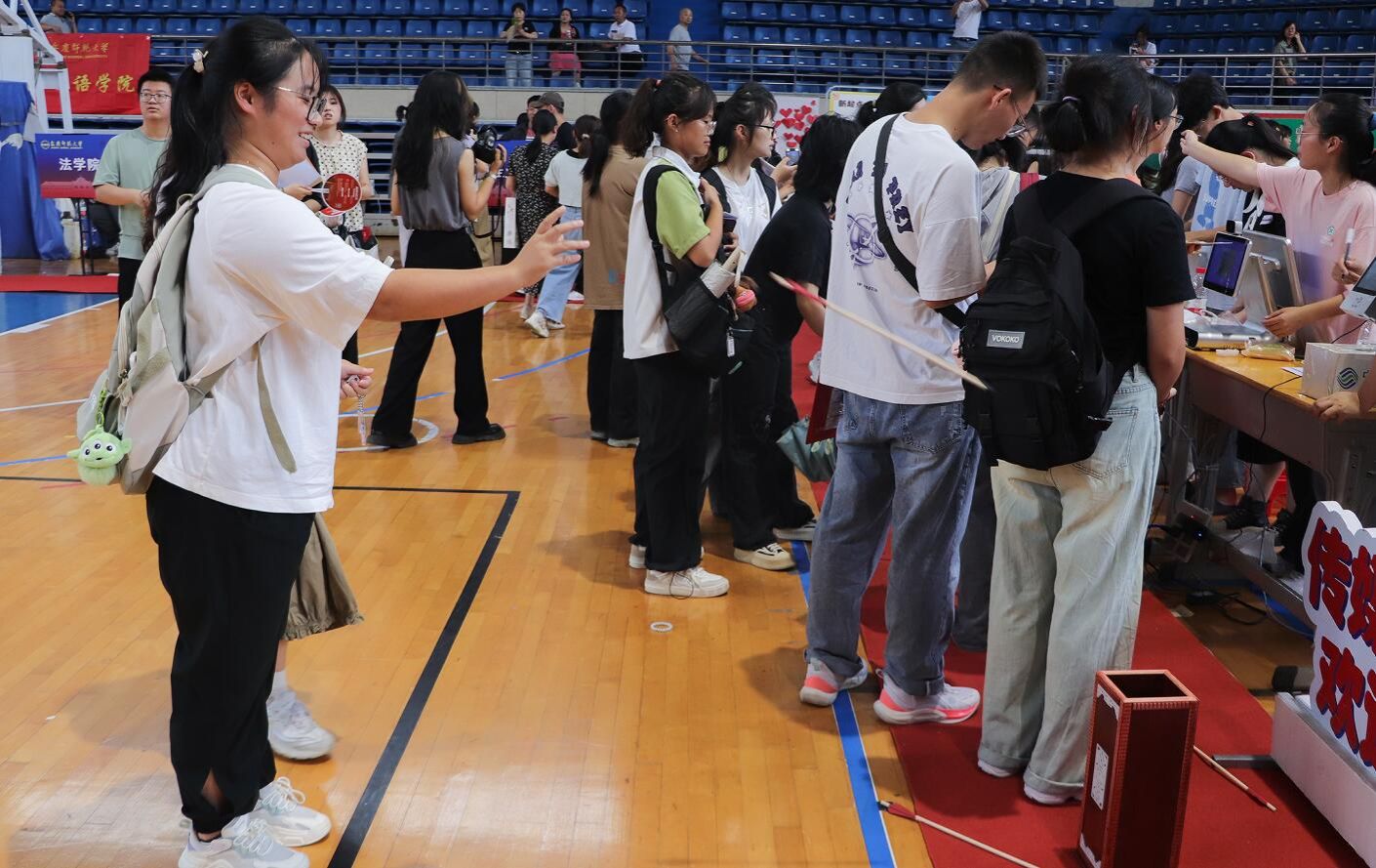 新闻传播学类专业2023(6)班的程俨完成报到后,尝试了投壶游戏。“第一天来公司,还有些拘束,但是玩了这个游戏后,我的心情得到放松。”他表示,游戏结果并不是最重要的东西,玩游戏重在体验。游戏过程中,新生们不断调整自己与投壶的距离和投射的方向,一次又一次投掷着。