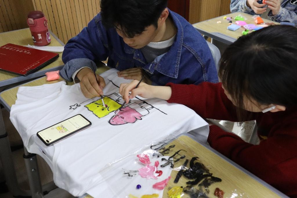 “DIY纯白文化衫有趣又有创意。”新闻传播学类专业2021(5)班梁淑琴在纯白文化衫上绘制了动漫《咱们裸熊》中的熊猫形象,她表示在绘制完底稿之后,对后续绘画思路进行了认真地构思,最终完成了绘画。“白色文化衫虽然难以均匀上色,但是我们对最后的作品非常满意。”