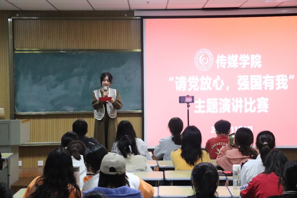 “百年青春心向党,矢志报国新时代……”,演讲伊始,新闻传播学类专业2021(1)班的曹旭表达了当代青年人一心向党、一心为国的坚定信念。曹旭以中国共产党的诞生为切入点,转动历史的车轮带大家领略党建百年风雨,用“一带一路”、中国天眼等伟大成就彰显泱泱大国的壮志豪情。“作为新时代青年,我们要‘仰望星空,脚踏实地’、‘披荆斩棘,奋力奔跑’,勇担时代重任。”曹旭说。“青年是国家独有的风景线,从青年人可以看到国家的未来。”谈及对本次演讲主题的理解,曹旭笑称,青年人应当自立、自强、自信,既然强国有“我”,青年人就一定要勇担责任。“我希望自己以后可以好好学习,为国家的建设贡献一份自己的力量。”