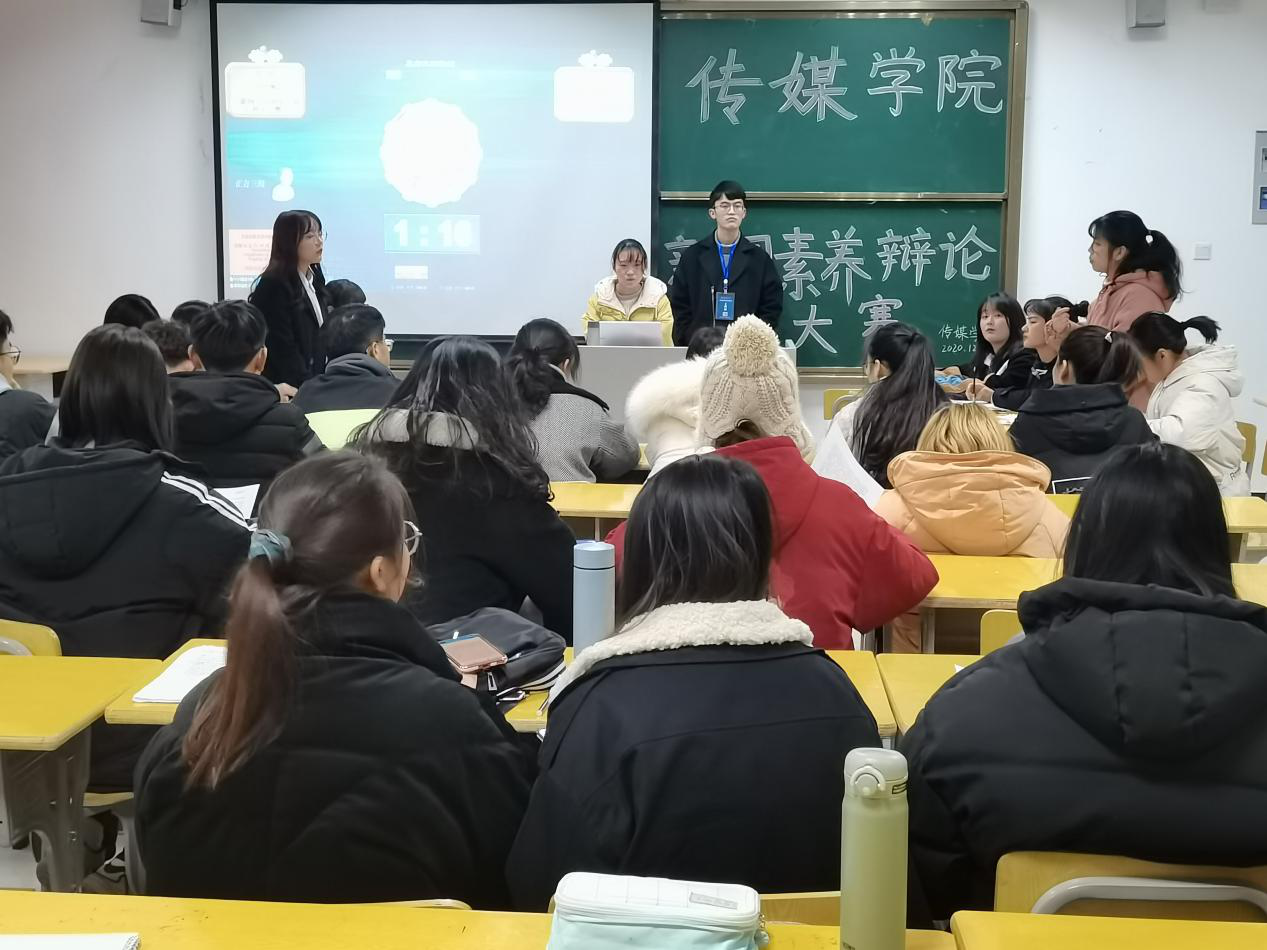 最后进行的是2019级新闻学专业代表队和2020级网络与新媒体专业代表队,他们的辩题是“同意娱乐至死或反对娱乐至死”。辩题的难理解性加大了辩论比赛的难度,正反双方在辩论比赛中“针锋相对”,据理力争。