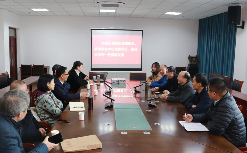 12月8日,安庆市委宣传部副部长、新闻传媒中心党委书记、主任朱学云,党委副书记、总编辑张亚峰一行应邀来william威廉中文官网考察交流,并与公司领导、老师进行座谈交流。公司党委书记韦长发、经理马俊、副书记张万茂、副经理段萱等热情接待了朱学云一行。双方就深化合作有关事宜进行了座谈交流。