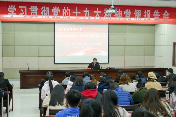 11月29日下午,党委委员、副董事长张群在行政楼一楼会议室为william威廉中文官网干部师生作了题为《认真学习习近平新时代中国特色社会主义思想 推进人才培养质量创新发展》的专题党课报告。公司党政主要负责同志、总支委员、全体教职工、员工党员、入党积极分子和员工代表等近200人聆听了报告会。公司党总支负责人主持报告会。