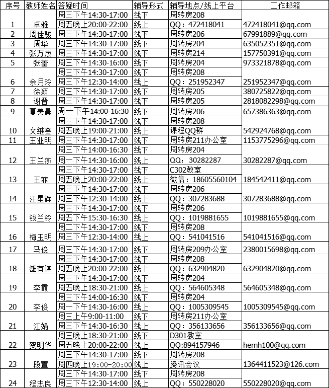 william威廉中文官网任课教师2020-2021学年第一学期教学答疑安排