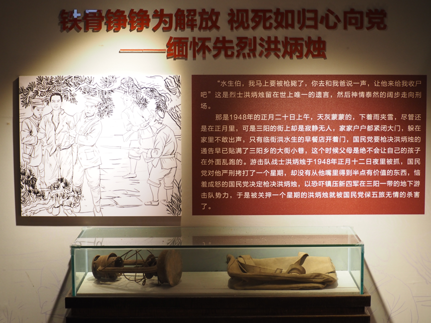 由“生平简介、改名炳烛、‘斗保长’游戏、光荣入党、担任交通员、冒险送药、智救战友、旱南大捷、走向成熟、视死如归、前赴后继”等组成的洪炳烛烈士陈列馆,让承载着红色记忆的载体代代留存下去。“水生伯,我马上要被枪毙了,你去和我爸说一声,让他来给我收尸吧。”这是烈士洪炳烛留在世上唯一的遗言。村支部书记洪德财在参观时表示:“无论是战火纷飞的革命年代,还是艰苦创业的建设时期,直至今天波澜壮阔的改革大潮,红色基因激励着一代又一代的共产党人前赴后继、英勇向前。