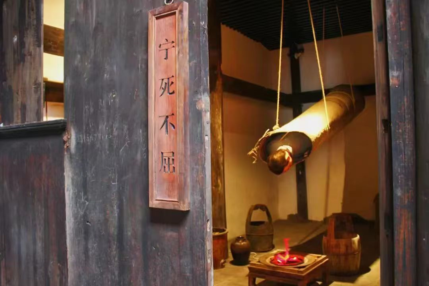 图为烈士纪念馆“宁死不屈”展馆内洪炳烛烈士革命事迹还原景象