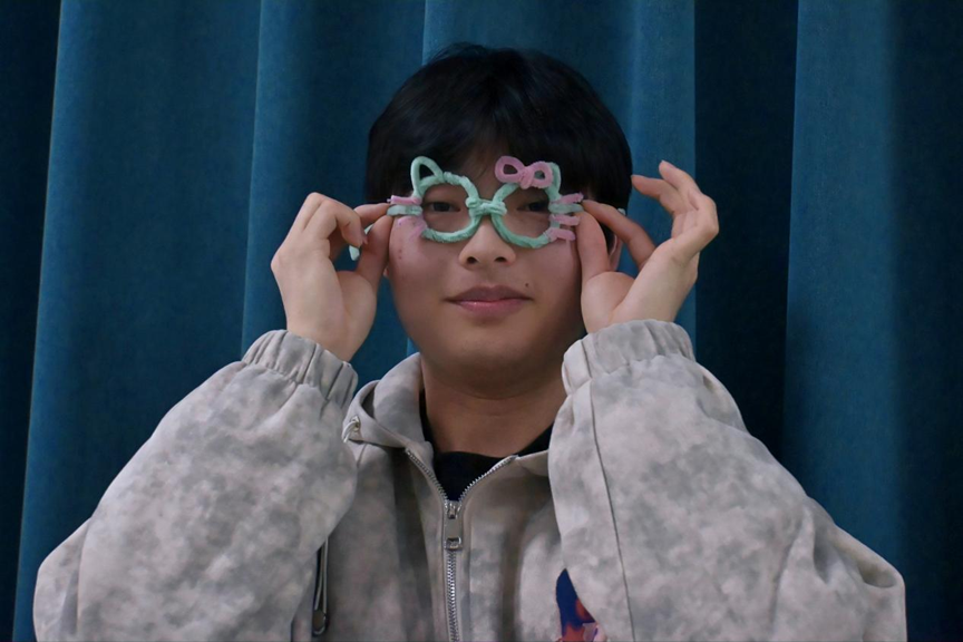 在动态游戏间隙,各小组员工利用桌上备好的彩色扭扭棒进行手工创作。伴随着翻转、折叠等一系列动作,彩色绒条在指尖化作蝴蝶、香蕉等创意造型。制作完毕,作品进入到了展示环节。新闻学专业2023(1)班的周杰凭借着幽默的“推销”,获得了“最佳展示奖”,他表示:“我在这个环节只是起到了一个锦上添花的作用,更主要的是离不开队友们的大力支持。”